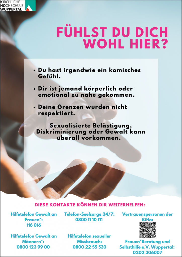 Barbara Matt hat ein Plakat zum Thema sexualisierte Gewalt für die Toiletten der Kirchlichen Hochschule entworfen. Es sensibilisiert Menschen an der KiHo für Grenzüberschreitungen und informiert Betroffene über Hilfsangebote.