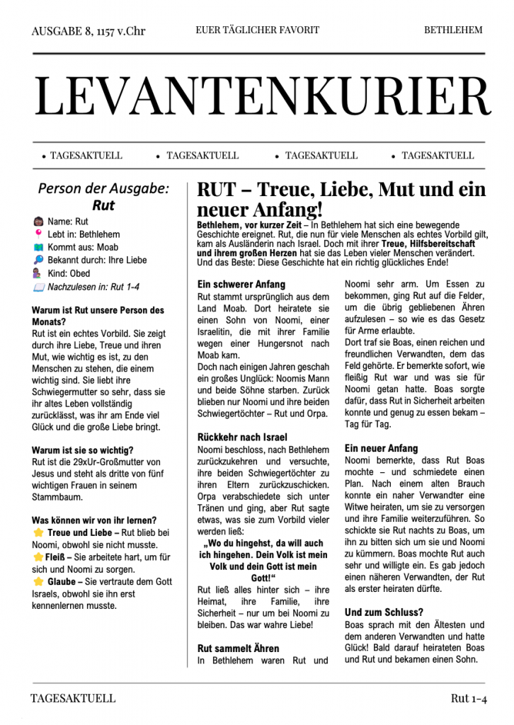 Ayleen Badzun hat eine Kindergottesdienstreihe zu Tamar, Rahab, Rut, Batseba und Maria entworfen – den Frauen, die im Stammbaum Jesu (Mt 1,1-17) genannt werden. Die Materialien und Umsetzungsimpulse stehen allen, die in religionspädagogischer Arbeit in Schule und Gemeinde aktiv sind, unter Einhaltung des Copyrights hier kostenfrei zum Download zur Verfügung. Ayleen Badzun stellte ihre Ausarbeitung in einer Fortbildung für Religionslehrkräfte der EKiR vor und stieß damit auf großes Interesse.